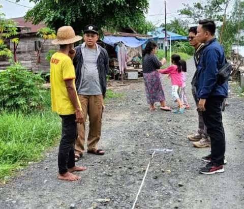 Agung didampingi warga setempat, melihat langsung petugas Dinas Pekerjaan Umum dan Penataan Ruang Batola melakukan pengukuran jalan yang akan diperbaiki.