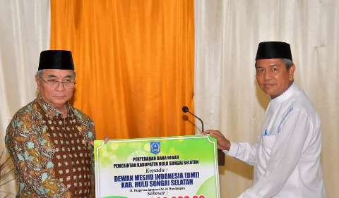 Bantuan dana hibah tersebut diserahkan langsung oleh Bupati Achmad Fikry kepada Ketua MUI Kabupaten HSS, Jamhari Muhdin dan Ketua DMI Kabupaten HSS, H Muhammad Thaha, didampingi Sekda Muhammad Noor.