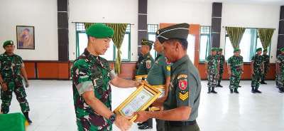 Teks foto: Dandim 1022/Tanah Bumbu, Letkol Inf Boni Berdian menyerahkan piagam penghargaan usai memimpin acara Korp Raport Purna Tugas anggota di Aula Makodim setempat, Jumat (19/07/24). (Ist)