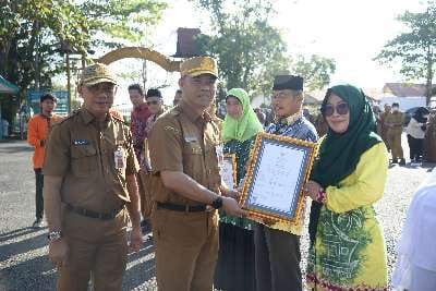 Teks foto: Sekda Batola Ir. H. Zulkipli Yadi Noor menyerahkan penghargaan kepada Koperasi dan pelaku usaha mikro usai Upacara Peringatan Hari Koperasi ke-77. (Ist/Kominfo)(kalselpos.com)