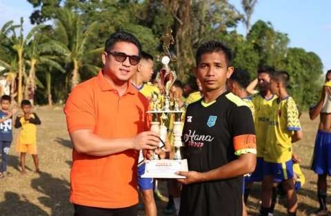 Teks foto : Ketua DPRD HSS Akhmad Fahmi menyerahkan hadiah kepada pemenang turnamen sepak bola.(sofan)
