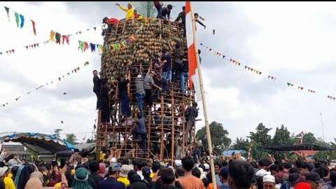 Selayaknya panjat pinang, puluhan orang berebut mencapai posisi tertinggi untuk mengunduh buah. Kemudian nanas-nanas itu dilempar kepada ratusan warga yang berdesakan menunggu di bawah.
