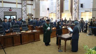 Prosesi pelantikan ditandai dengan pengucapan sumpah/janji dalam rapat paripurna DPRD Balangan yang berlangsung di ruang Rapat Paripurna, Senin (8/9/2025).