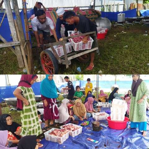 Ia mengatakan, untuk prosesnya sudah masuk ke tahap pemotongan daging, dibantu oleh ibu-ibu yang ada disini untuk segera bisa dimasak agar dapat disajikan sebagai konsumsi bagi para jamaah nantinya.