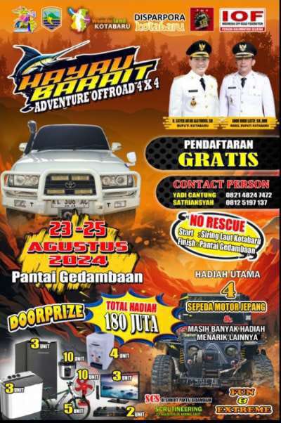 Kotabaru, wartaberitaindonesia.com – Pemerintah Daerah Kabupaten Kotabaru melalui Dinas Pariwisata Pemuda dan Olahraga telah merilis jadwal Event Perdana Hayau Barait Offroad 4×4.