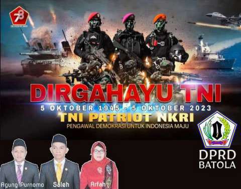 Iklan ucapan Dirgahayu TNI 5 Oktober 2023 admin3 November 202317 Februari 2024 Iklan ucapan Dirgahayu TNI 5 Oktober 2023 Pos terkaitDPRD Kalsel Desak Perusahaan Tambang Benahi Izin dan Pengelolaan LimbahHUT ke-27 Banjarbaru: Erna Lisa Halaby Ajak Warga Wujudkan “Banjarbaru Emas”Afif Khalid: Kampus dan Sekolah Harus Bebas Kekerasan Seksual!Ketua DPRD HSS Tinjau Pelayanan IGD dan Farmasi RSUD Brigjend Hasan BasryAdrizal Nilai Pembangunan Banjarbaru Semakin Nyata Setahun TerakhirBatola Siap Jadi Tuan Rumah MTQ Nasional XXXVII Tingkat Provinsi Kalsel 2026