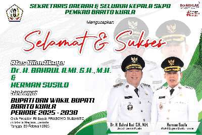 Iklan Ucapan Sekretaris Daerah Dan Seluruh Kepala SKPD Pemkab Barito Kuala Mengucapkan Selamat Dan Sukses Atas Dilantiknya Bupati Dan Wakil Bupati Kabupate Barito Kuala Periode 2025 – 2030