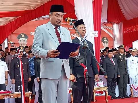 6. PROKLAMASI – Ketua DPRD Banjarmasin membacakan teks proklamasi kemerdekaan Republik Indonesia 17 Agustus 2023 di halaman kantor Balaikota Banjarmasin.