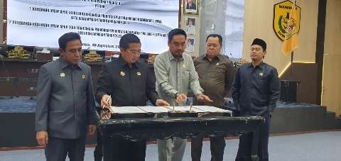 5. PENANDATANGANAN – Unsur Pimpinan DPRD Banjarmasin menandatangani Kesepakatan Bersama Kebijakan Umum APBD (KUA) dan Rancangan Prioritas Plafon Anggaran Sementara (PPAS) Banjarmasin Tahun Anggran 2024.