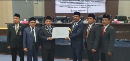 FOTO BERSAMA – Unsur Pimpinan DPRD dan Walikota Banjarmasin foto bersama usai penandatanganan persetujuan bersama penetapan Peraturan Daerah (Perda) Kota Banjarmasin tentang Pajak Daerah.