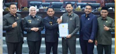 5. Pimpinan DPRD Banjarmasin foto bersama dengan Wali Kota dan Wakil Wali Kota Banjarmasin usai Rapat Paripurna Penetapkan Perda Pertanggungjawaban APBD 2024