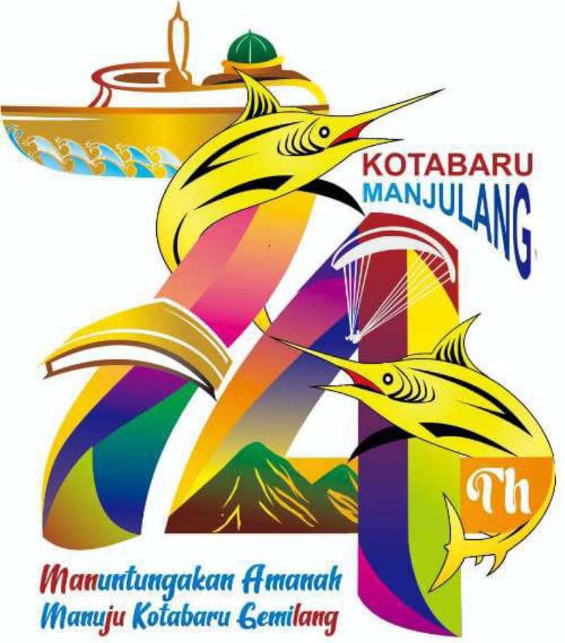 “Angka 74 dengan warna yang beragam, dua ekor ikan todak menggambarkan ikonnya kotabaru sebagai daerah pesisir, kapal berkubah mesjid dan panggung, bukit hijau dengan paralayang dan sepuluh ombak biru dibawah kapal adalah representasi 10 tahun pengabdian membawa bahtera amanah pembangunan,” ungkapnya.