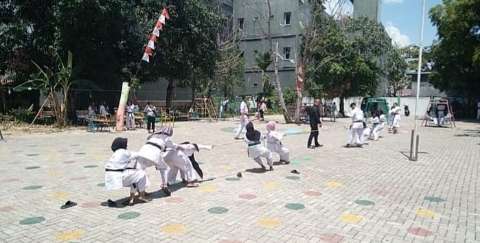 Tak hanya mengikuti lomba, seperti tarik tambang dan tendang balon serta menusuk balon yang melatih ketenangan dan ketepatan, sekitar 100 karateka dari 12 Dojo juga melakukan latihan fisik ringan.