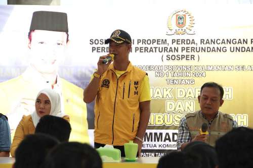 Teks foto : Wakil Ketua Komisi II DPRD Kalsel Muhammad Yani Helmi saat sosialisasikan Perda Pajak dan Retribusi Daerah, di Desa Sari Gadung, Kecamatan Simpang Empat, Kabupaten Tanah Bumbu, Jumat (2/2). (Istimewa)