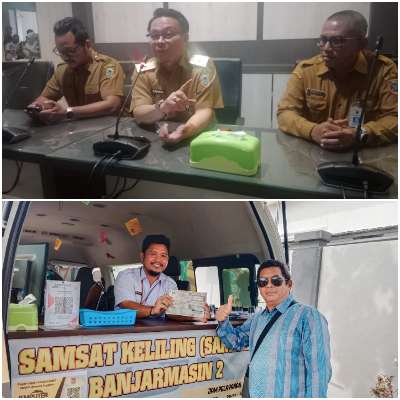 Teks Foto 1. Kepala Bapenda Provinsi Kalsel, H. Subhan Nor Yaumil, SE, MSI (tengah) didampingi H. Munazir Hadrani, S.AP, MM (kanan) dan Indra Surya Saputra, S.STP, M.IP, 2. Layanan Samsat Keliling Bagi Wajib Pajak (WP). (Ist)