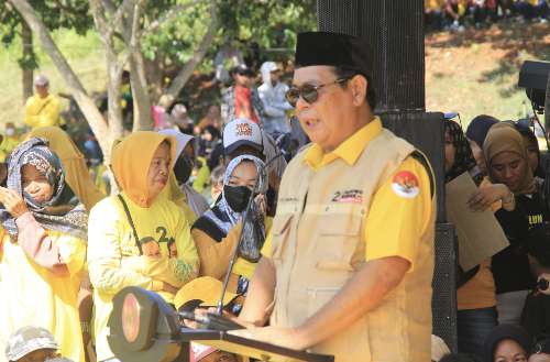 “Mari semua menyambut penuh gegap gempita dengan memilih wakil rakyat dan pucuk pimpinan negeri ini dari Partai Golkar,” ajaknya.