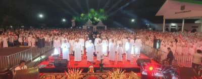 Teks foto: Ribuan jamaah menghadiri Tanah Bumbu Bershalawat di halaman Gedung Mahligai Bersujud Kapet, Batulicin, Minggu (20/10/2024) malam. (Istimewa)