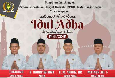 Ucapan Hari Raya Idul Adha admin11 Juni 202411 Juni 2024 Ucapan Hari Raya Idul Adha Pos terkaitKetua DPRD HSS Tinjau Pelayanan IGD dan Farmasi RSUD Brigjend Hasan BasryAdrizal Nilai Pembangunan Banjarbaru Semakin Nyata Setahun TerakhirBatola Siap Jadi Tuan Rumah MTQ Nasional XXXVII Tingkat Provinsi Kalsel 2026 Empat Desa di Batola Raih Penghargaan Desa Peduli Stunting 2026Pemkab Batola Gelar Rakor Percepatan Imunisasi, Tekankan Kolaborasi dan InovasiHUT ke-23 Balangan, Sri Huriyati Hadi Ajak Masyarakat Perkuat Kebersamaan Bangun Daerah